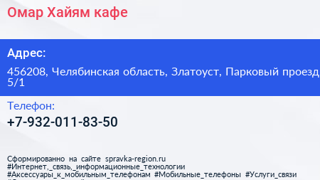 Омар Хайям, кафе по адресу 456208, Челябинская область, Златоуст, Парковый проезд, 5/1 в дальнейшем Организация, размещена в следующих категориях: