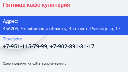 Пятница, кафе-кулинария по адресу 456205, Челябинская область, Златоуст, Румянцева, 17 в дальнейшем Организация, размещена в следующих категориях: