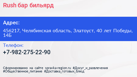 Rush, бар-бильярд по адресу 456217, Челябинская область, Златоуст, 40 лет Победы, 14Б в дальнейшем Организация, размещена в следующих категориях: