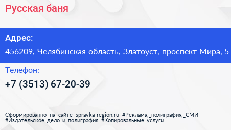 Русская баня по адресу 456209, Челябинская область, Златоуст, проспект Мира, 5 в дальнейшем Организация, размещена в следующих категориях: