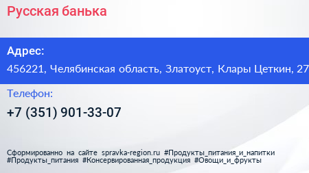 Русская банька по адресу 456221, Челябинская область, Златоуст, Клары Цеткин, 27 в дальнейшем Организация, размещена в следующих категориях: