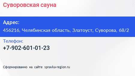 Суворовская, сауна по адресу 456216, Челябинская область, Златоуст, Суворова, 68/2 в дальнейшем Организация, размещена в следующих категориях: