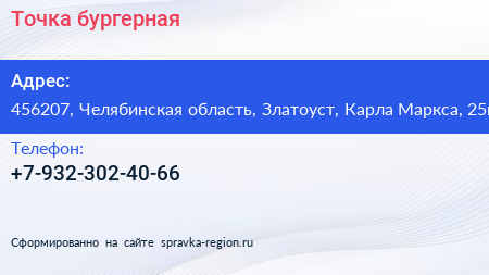 Точка, бургерная по адресу 456207, Челябинская область, Златоуст, Карла Маркса, 25г в дальнейшем Организация, размещена в следующих категориях: