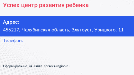 Успех, центр развития ребенка по адресу 456217, Челябинская область, Златоуст, Урицкого, 11 в дальнейшем Организация, размещена в следующих категориях: