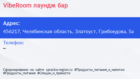 VibeRoom, лаундж-бар по адресу 456217, Челябинская область, Златоуст, Грибоедова, 5а в дальнейшем Организация, размещена в следующих категориях: