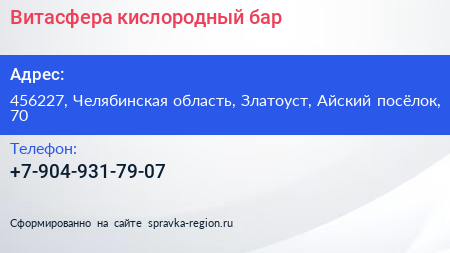 Витасфера, кислородный бар по адресу 456227, Челябинская область, Златоуст, Айский посёлок, 70 в дальнейшем Организация, размещена в следующих категориях: