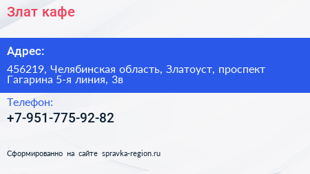 Злат, кафе по адресу 456219, Челябинская область, Златоуст, проспект Гагарина 5-я линия, 3в в дальнейшем Организация, размещена в следующих категориях: