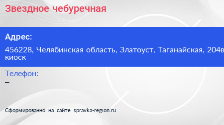 Звездное, чебуречная по адресу 456228, Челябинская область, Златоуст, Таганайская, 204в киоск в дальнейшем Организация, размещена в следующих категориях: