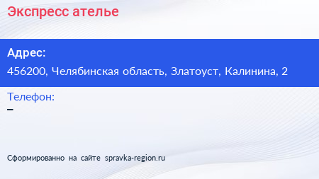 Экспресс-ателье по адресу 456200, Челябинская область, Златоуст, Калинина, 2 в дальнейшем Организация, размещена в следующих категориях: