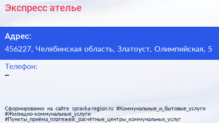 Экспресс-ателье по адресу 456227, Челябинская область, Златоуст, Олимпийская, 5 в дальнейшем Организация, размещена в следующих категориях: