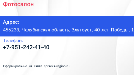 Фотосалон по адресу 456238, Челябинская область, Златоуст, 40 лет Победы, 17 в дальнейшем Организация, размещена в следующих категориях: