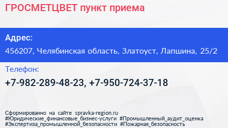 ГРОСМЕТЦВЕТ, пункт приема по адресу 456207, Челябинская область, Златоуст, Лапшина, 25/2 в дальнейшем Организация, размещена в следующих категориях: