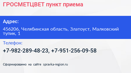 ГРОСМЕТЦВЕТ, пункт приема по адресу 456206, Челябинская область, Златоуст, Малковский тупик, 1 в дальнейшем Организация, размещена в следующих категориях: