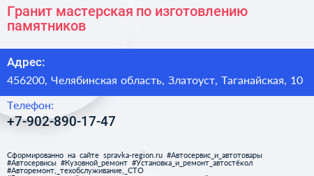 Гранит, мастерская по изготовлению памятников по адресу 456200, Челябинская область, Златоуст, Таганайская, 10 в дальнейшем Организация, размещена в следующих категориях: