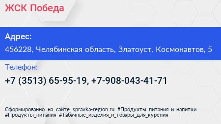 ЖСК Победа по адресу 456228, Челябинская область, Златоуст, Космонавтов, 5 в дальнейшем Организация, размещена в следующих категориях: