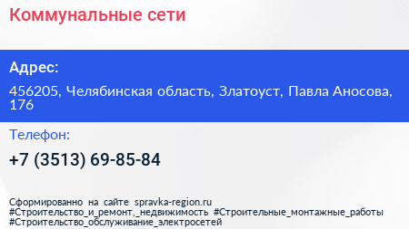 Коммунальные сети по адресу 456205, Челябинская область, Златоуст, Павла Аносова, 176 в дальнейшем Организация, размещена в следующих категориях: