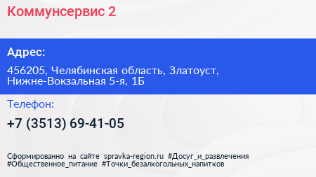 Коммунсервис-2 по адресу 456205, Челябинская область, Златоуст, Нижне-Вокзальная 5-я, 1Б в дальнейшем Организация, размещена в следующих категориях: