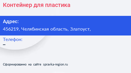 Контейнер для пластика по адресу 456219, Челябинская область, Златоуст, в дальнейшем Организация, размещена в следующих категориях: