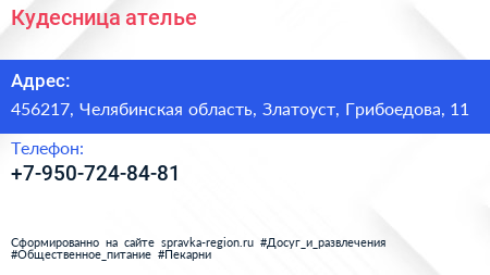 Кудесница, ателье по адресу 456217, Челябинская область, Златоуст, Грибоедова, 11 в дальнейшем Организация, размещена в следующих категориях: