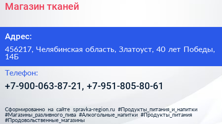Магазин тканей по адресу 456217, Челябинская область, Златоуст, 40 лет Победы, 14Б в дальнейшем Организация, размещена в следующих категориях: