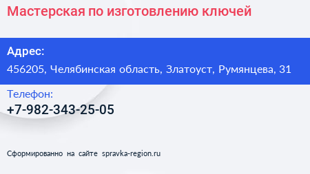 Мастерская по изготовлению ключей по адресу 456205, Челябинская область, Златоуст, Румянцева, 31 в дальнейшем Организация, размещена в следующих категориях: