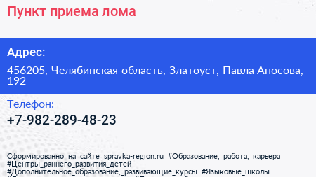 Пункт приема лома по адресу 456205, Челябинская область, Златоуст, Павла Аносова, 192 в дальнейшем Организация, размещена в следующих категориях: