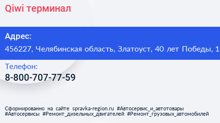 Qiwi, терминал по адресу 456227, Челябинская область, Златоуст, 40 лет Победы, 13 в дальнейшем Организация, размещена в следующих категориях: