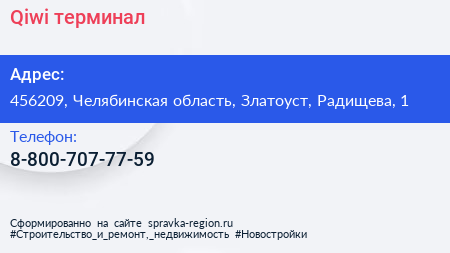 Qiwi, терминал по адресу 456209, Челябинская область, Златоуст, Радищева, 1 в дальнейшем Организация, размещена в следующих категориях: