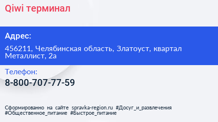 Qiwi, терминал по адресу 456211, Челябинская область, Златоуст, квартал Металлист, 2а в дальнейшем Организация, размещена в следующих категориях: