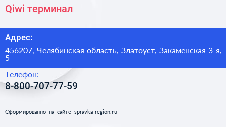 Qiwi, терминал по адресу 456207, Челябинская область, Златоуст, Закаменская 3-я, 5 в дальнейшем Организация, размещена в следующих категориях: