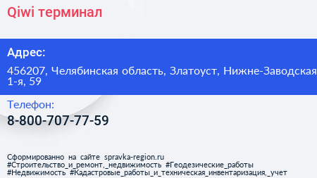 Qiwi, терминал по адресу 456207, Челябинская область, Златоуст, Нижне-Заводская 1-я, 59 в дальнейшем Организация, размещена в следующих категориях: