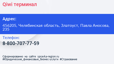 Qiwi, терминал по адресу 456205, Челябинская область, Златоуст, Павла Аносова, 235 в дальнейшем Организация, размещена в следующих категориях:
