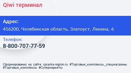 Qiwi, терминал по адресу 456200, Челябинская область, Златоуст, Ленина, 6 в дальнейшем Организация, размещена в следующих категориях: