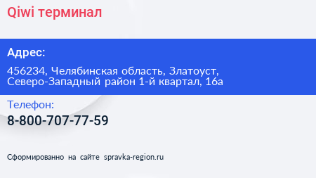 Qiwi, терминал по адресу 456234, Челябинская область, Златоуст, Северо-Западный район 1-й квартал, 16а в дальнейшем Организация, размещена в следующих категориях: