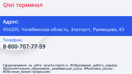 Qiwi, терминал по адресу 456205, Челябинская область, Златоуст, Румянцева, 43 в дальнейшем Организация, размещена в следующих категориях:
