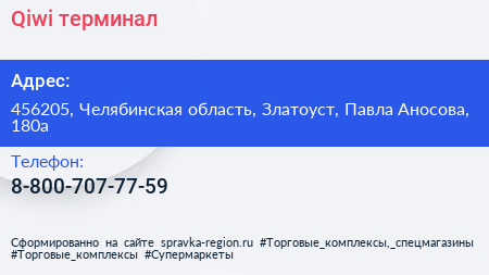Qiwi, терминал по адресу 456205, Челябинская область, Златоуст, Павла Аносова, 180а в дальнейшем Организация, размещена в следующих категориях: