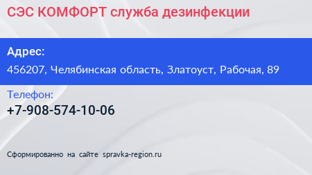 СЭС-КОМФОРТ, служба дезинфекции по адресу 456207, Челябинская область, Златоуст, Рабочая, 89 в дальнейшем Организация, размещена в следующих категориях: