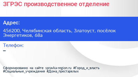 ЗГРЭС, производственное отделение по адресу 456200, Челябинская область, Златоуст, посёлок Энергетиков, 68а в дальнейшем Организация, размещена в следующих категориях: