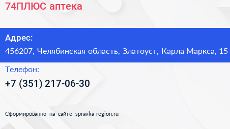 74ПЛЮС, аптека по адресу 456207, Челябинская область, Златоуст, Карла Маркса, 15 в дальнейшем Организация, размещена в следующих категориях: