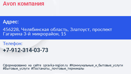 Avon, компания по адресу 456228, Челябинская область, Златоуст, проспект Гагарина 3-й микрорайон, 15 в дальнейшем Организация, размещена в следующих категориях: