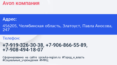 Avon, компания по адресу 456205, Челябинская область, Златоуст, Павла Аносова, 247 в дальнейшем Организация, размещена в следующих категориях: