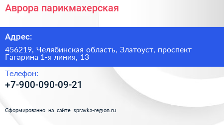 Аврора, парикмахерская по адресу 456219, Челябинская область, Златоуст, проспект Гагарина 1-я линия, 13 в дальнейшем Организация, размещена в следующих категориях: