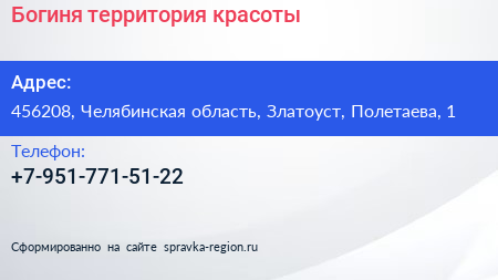 Богиня, территория красоты по адресу 456208, Челябинская область, Златоуст, Полетаева, 1 в дальнейшем Организация, размещена в следующих категориях: