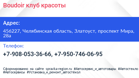 Boudoir, клуб красоты по адресу 456227, Челябинская область, Златоуст, проспект Мира, 28а в дальнейшем Организация, размещена в следующих категориях: