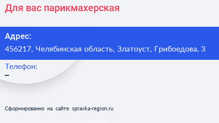 Для вас, парикмахерская по адресу 456217, Челябинская область, Златоуст, Грибоедова, 3 в дальнейшем Организация, размещена в следующих категориях: