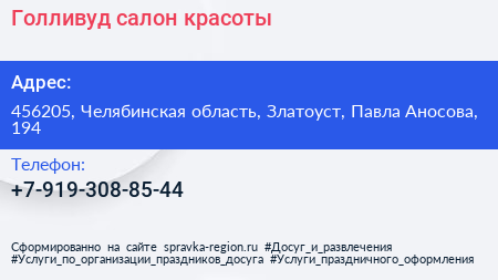 Голливуд, салон красоты по адресу 456205, Челябинская область, Златоуст, Павла Аносова, 194 в дальнейшем Организация, размещена в следующих категориях: