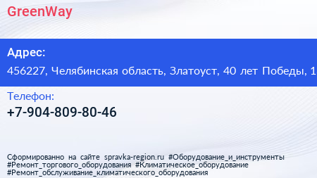 GreenWay по адресу 456227, Челябинская область, Златоуст, 40 лет Победы, 13 в дальнейшем Организация, размещена в следующих категориях: