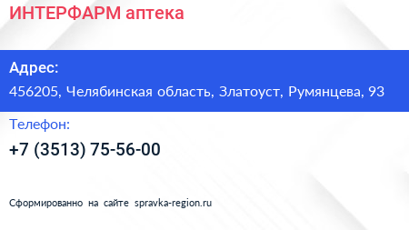 ИНТЕРФАРМ, аптека по адресу 456205, Челябинская область, Златоуст, Румянцева, 93 в дальнейшем Организация, размещена в следующих категориях: