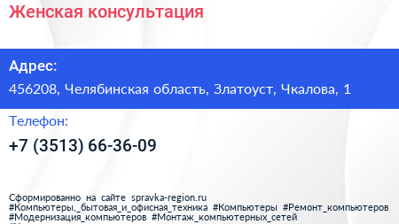 Женская консультация по адресу 456208, Челябинская область, Златоуст, Чкалова, 1 в дальнейшем Организация, размещена в следующих категориях: