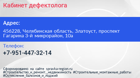 Кабинет дефектолога по адресу 456228, Челябинская область, Златоуст, проспект Гагарина 3-й микрорайон, 10а в дальнейшем Организация, размещена в следующих категориях: